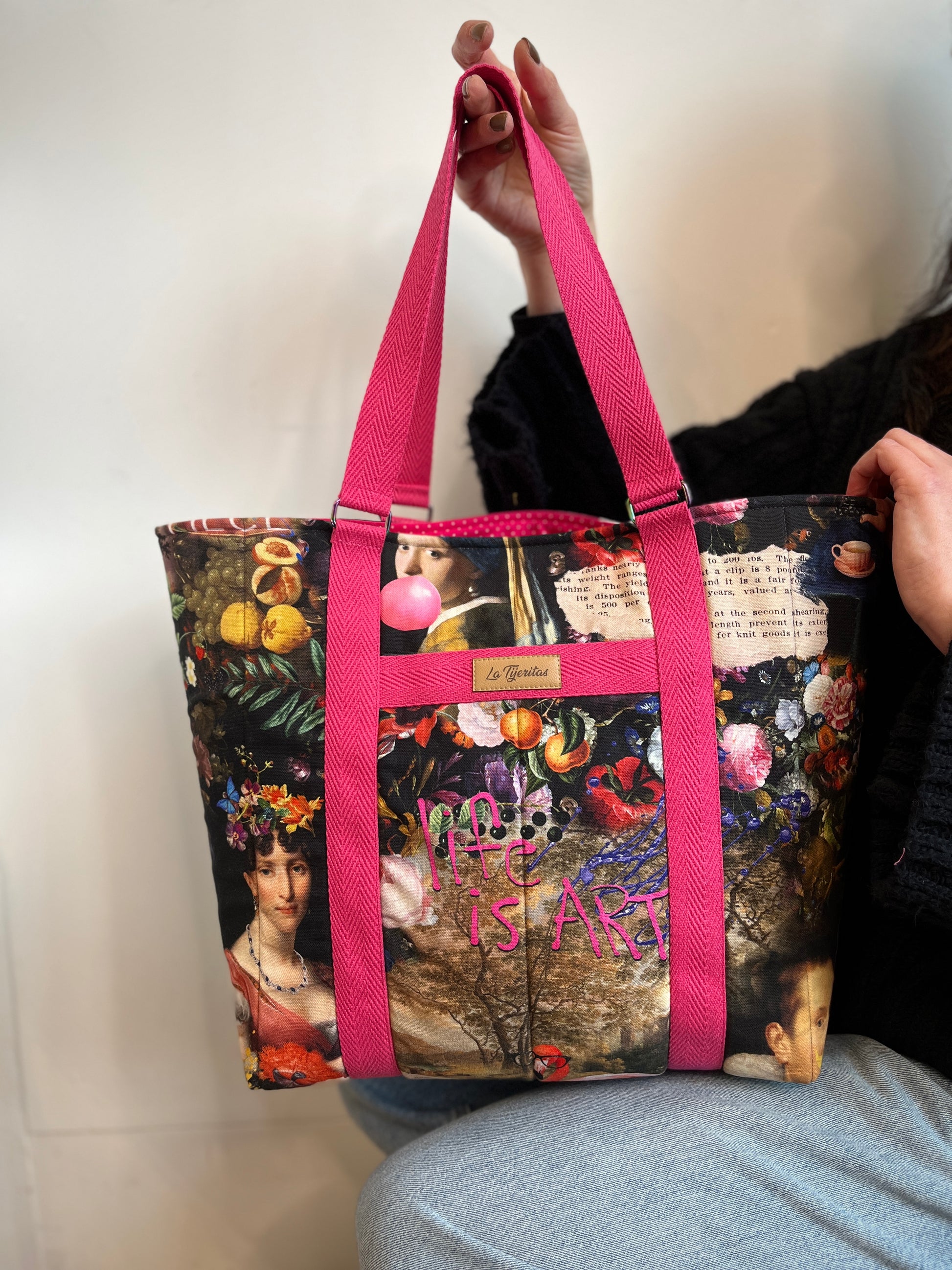 El modelo Pink Art, está confeccionado con una loneta de diseño procedente de Países Bajos. El estampado de estética Pop Art recrea las míticas obras del pintor Vermeer.